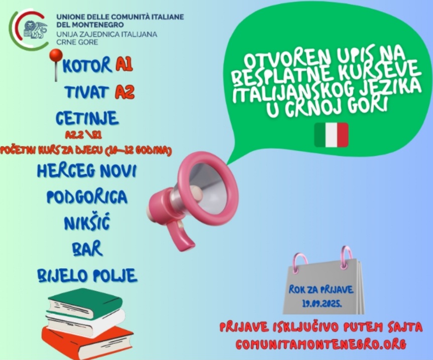 Unija Zajednica Italijana u Crnoj Gori, uz podrsšku fondova Republike Italije ponovo će organizovati besplatne kurseve italijanskog jezika u Herceg Novom.