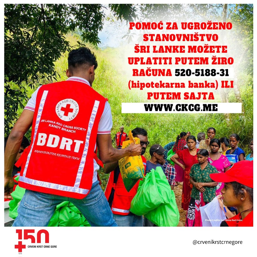 Pomoć pogođenom stanovništvu Šri Lanke možete uplatiti putem žiro-računa 520-5188-31, kod Hipotekarne banke ili putem online platforme na sajtu Crvenog krsta Crne Gore www.ckcg.me (dugme Donirajte).