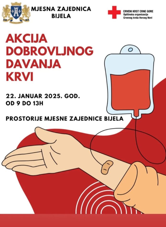 Prva ovogodišnja akcija dobrovoljnog davanja krvi u organizaciji hercegnovskog Crvenog krsta biće organizovana u srijedu 22. januara u prostorijama Mjesne zajednice Bijela.