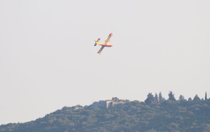 Požar iznad Njivica proširio se, prešao u Hrvatsku, pa su vidljiva dva kanadera koja lete iznad Kobile i gase taj požar.