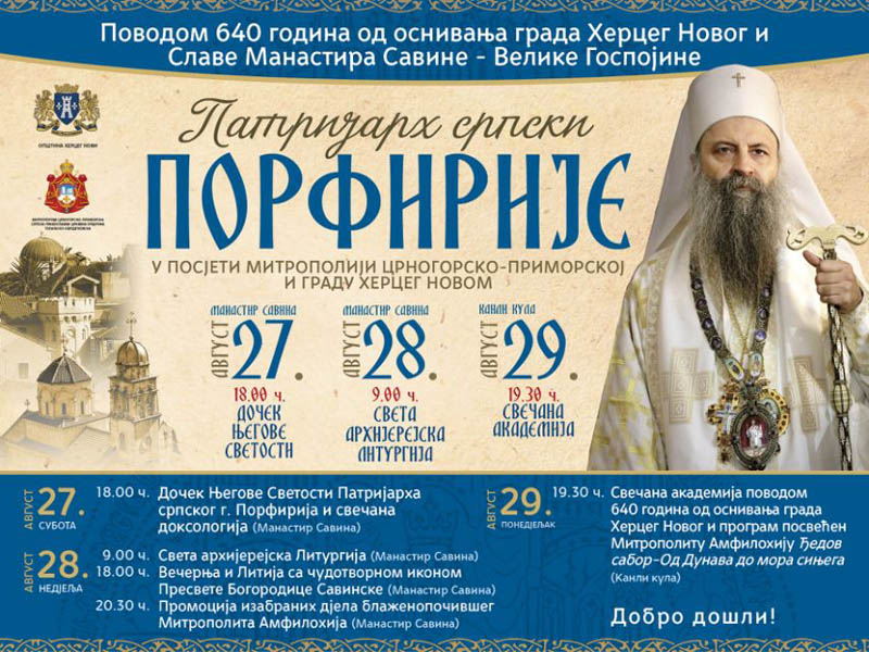 Patrijarh će u trodnevnoj zvaničnoj posjeti Herceg Novom boraviti povodom 640 godina od osnivanja grada i slave manastira Savina, Velika Gospojina, a na poziv Opštine Herceg Novi i Mitropolije crnogorsko-primorske.