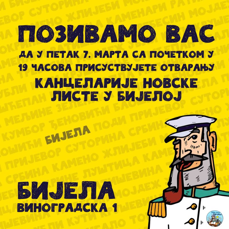 Novska lista, najveća hercegnovska politička stranka, poziva sve mještane Bijele i hercegnovske rivijere da u petak, 7. marta u 19:00 časova, svojim dolaskom uveličaju svečano otvaranje nove kancelarije Novske liste u Bijeloj, na adresi Vinogradska 1.