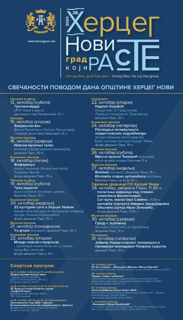 Dan opštine Herceg Novi, 28. oktobar, biće obilježen brojnim kulturnim, muzičkim, dječijim i sportskim programima koji će biti organizovani tokom ovog mjeseca pod sloganom „Herceg Novi, grad koji raste!“.