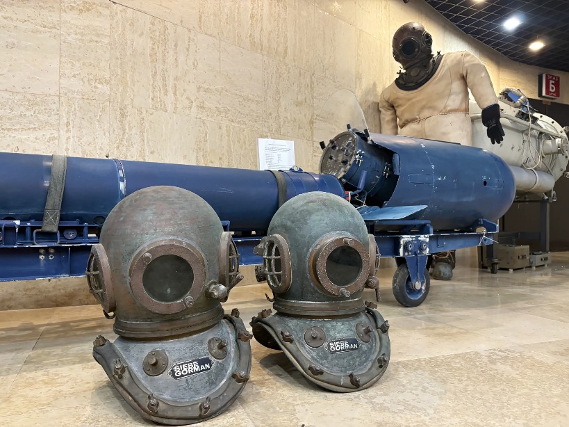 Svi oni koji do 03. novembra posjete dvoranu „Park“ dobiće jasniju sliku o tome kako je izgledao austrougarski ronilac u Boki sa početka prošlog vijeka i kakva oprema je kroz istoriju služila za istraživanje, osvajanje i dokumentovanje našeg podmorja – civilna i vojna ronilačka oprema korišćena u toku 20. vijeka, diverzantska dvosjedna ronilica, dekompresiona komora, diverzantska podvodna mina, podvodno kućište i kamera sa kojom se snimala serija „Tajne Jadrana“ emitovana 1975. godine…