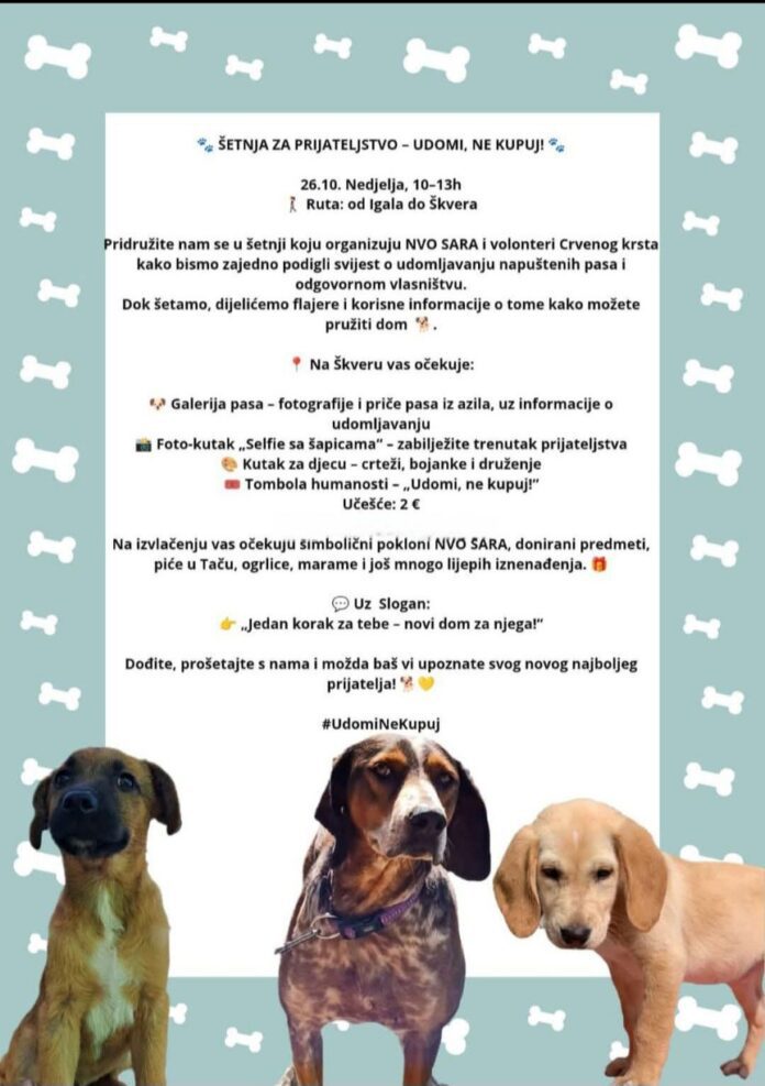“Pridružite nam se u šetnji koju organizuju NVO Sara i volonteri Crvenog krsta kako bismo zajedno podigli svijest o udomljavanju napuštenih pasa i odgovornom vlasništvu. Dok šetamo, dijelićemo flajere i korisne informacije o tome kako možete pružiti dom”, pozivaju organizatori.
