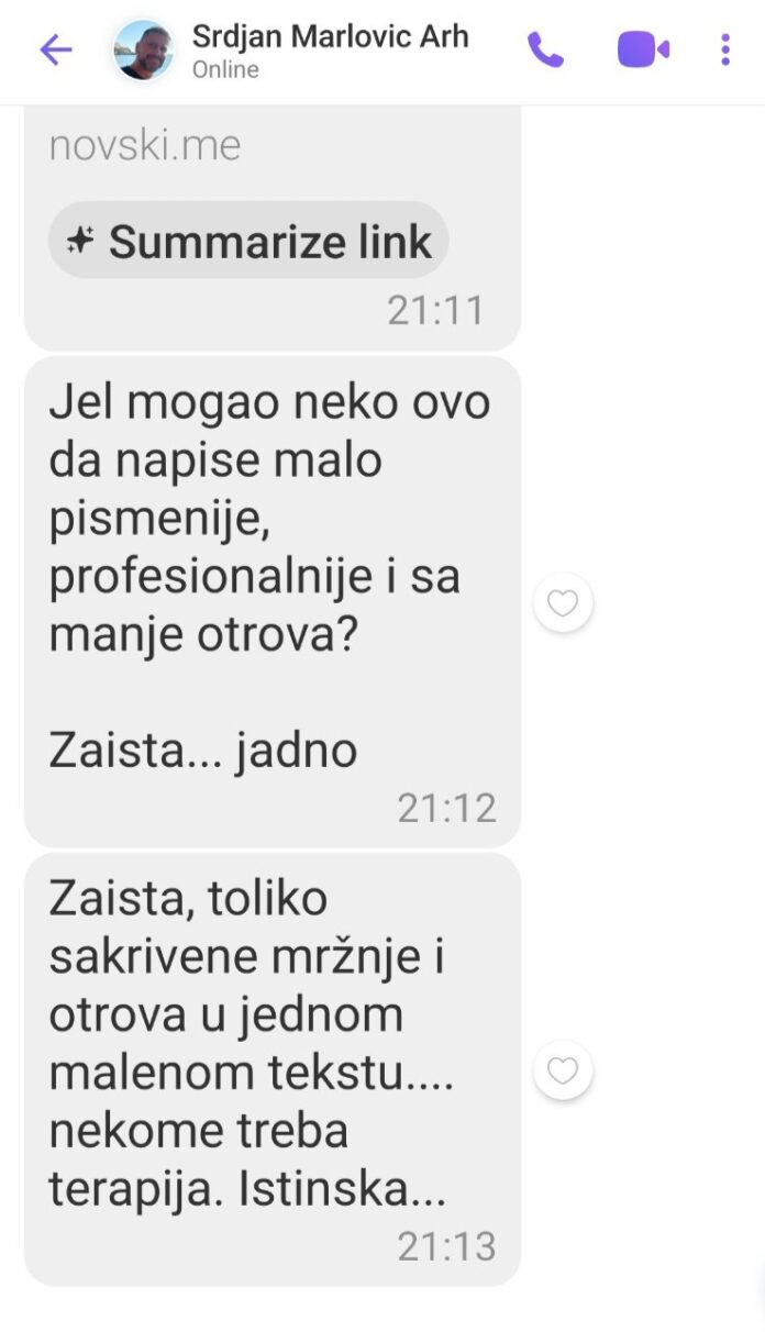 Ali, tekst je pogodio arhitektu i konzervatora Srđana Marlovića, toliko da je sebi, dao slobodu da nam “drži lekciju” iz pismenosti i uputi uvredljive i prijeteće riječi novinarki Novskog portala:
