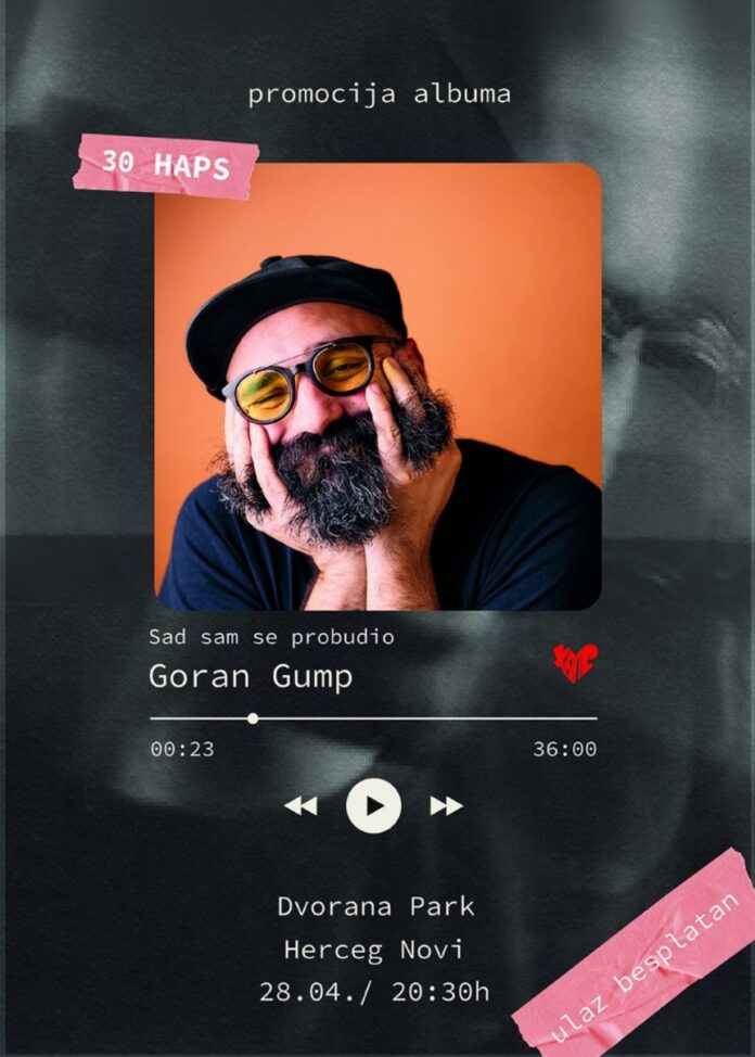 Dio pratećeg programa ovogodišnjih Hercegnovskih aprilskih pozorišnih svečanosti je promocija albuma „Sad sam se probudio“ Gorana Gumpa, 28. aprila u 20:30 časova u Dvorani Park, a ulaz je besplatan.